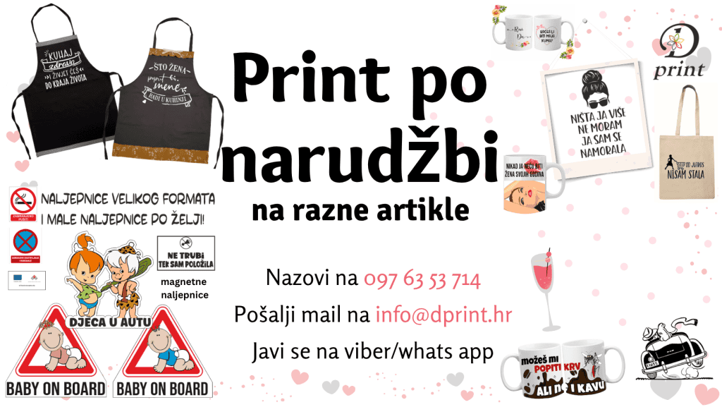 D print je mala radionica u Rijeci gdje se trudimo ispuniti sva Vaša očekivanja i istaknuti se kvalitetom tiska. Naša je posebnost u tome što smo tu za Vas, da napravimo dizajn po Vašoj želji i printamo ga na neki artikal koji odaberete. Za Vas možemo napraviti tisak na majice, šalice, ukrasne jastuke, torbe, puzzle i još mnogo drugih artikala. Radimo i tisak na slikarsko platno u više dimenzija. Ako na našoj stranici ne pronađete nešto što bi Vam odgovaralo, slobodno nas kontaktirajte i pošaljite Vašu ideju a mi ćemo je realizirati. Raduje nas kad su naši kupci zadovoljni i veselimo se Vašem javljanju. Osim personaliziranih artikala nudimo i promotivne artikle za firme kako bi se što bolje prezentirali svojim klijentima pa tako izrađujemo vizitke, letke, tisak logotipa na majice, šalice, torbe… Za sva pitanja slobodno nas kontaktirajte.